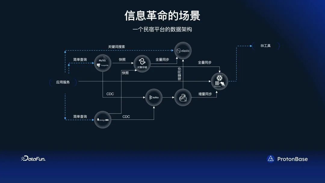 随着应用的用户越来越多,单机的关系型数据库很快就无法满足业务的性能需求,因此不得不引入 MongoDB 这样的 NoSQL 数据库。NoSQL 数据库的一个好处是可以通过增加机器这种水平扩容的方式提升性能,从而满足业务日益增长的性能需求。在解决了性能问题之后,用户数继续快速增长,用户对应用的需求也日益复杂。比如用户不再满足于通过全名去查找民宿,而是希望能够根据一些关键词找到自己感兴趣的民宿,MongoDB 并不能高效实现这一需求。因此,系统又引入了 ElasticSearch 这样的搜索引擎。为了让搜索引擎能够提供搜索服务,首先需要把数据导入到搜索引擎之中。数据的导入一般分为两种形式,第一种是全量的数据导入,关系型数据库和 NoSQL 数据库里面的数据会定期以全量的方式导入到搜索引擎。如果应用对数据的时效性有比较高的要求,还要再引入增量的数据同步链路,比如采用 Kafka 和 Flink 这样的技术把上游的增删改同步到搜索引擎之中。当搜索引擎有了这些数据后,就可以为应用提供高性能的关键词搜索了。至此,通过利用各类数据库产品,系统具备了基础信息的存储和高效提取能力。此外,我们还希望对信息进行汇总分析。比如分析今年五一假期民宿营收和去年的同比情况、五一假期全国最热门的 10 个城市是哪些。为了高效获得这些汇总信息,系统又引入了像 Snowflake 或者 Hive 这类数仓产品。并且把数据从各个数据库同步到这个数仓之中,就可以使用数仓进行复杂的 BI 分析。可以看到:一个业务往往需要同时使用多个数据库和数仓产品,并且需要在它们之间进行复杂的数据同步。