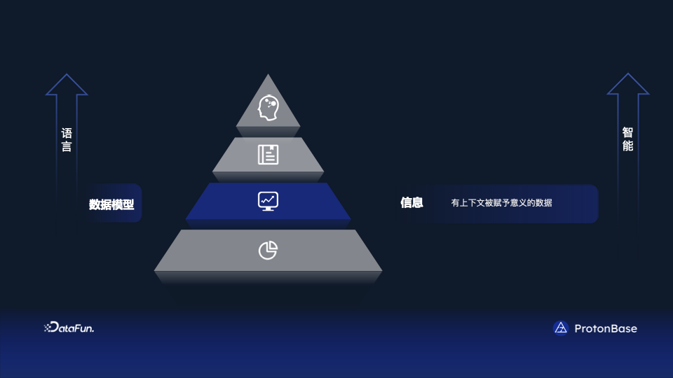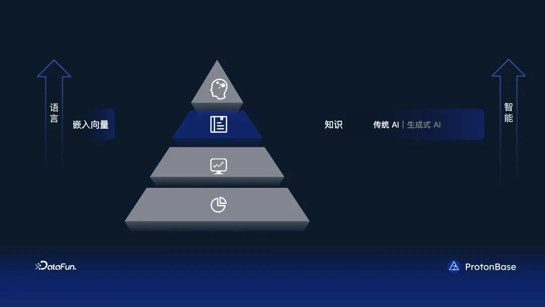 总结一下,数据首先以比特的形式存储在数据系统之中。系统并不理解数据,数据在系统中还不具备任何智能。通过引入关系模型或文档模型这类表达信息的语言,这些元数据给数据提供了上下文,赋予了数据结构,就产生了信息。建立在这些数据模型之上的关系型数据库、NoSQL 数据库、以及数仓等产品为信息的存储、提取、管理、以及汇总分析提供了强大的工具,促进了互联网业务的快速发展。再往上是知识层的抽象,我们引入了嵌入向量这种强大的数学语言来表达知识。这种全新的语言为高效地表达和处理知识打开了大门,系统的智能也变得更加高级。再往上是智慧层,当奇点到来 ,AGI 实现之后,机器也会和人一样具有智慧,可以对知识做深刻的推理,并且做出战略性的决策。也许当那天到来我们将会发现表达智慧的新语言。