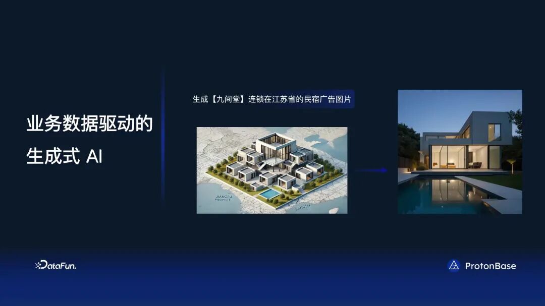 举一个例子,九间堂民宿希望在江苏做一个广告,需要让 AI 为这个广告营销活动生成一个图片,下图左侧就是 AI 生成的图片。可以看到这个图片里有九间房子,房子位于地图上的江苏。因为通用的模型只有这些信息,所以能够生成这样的图片算是合格,但我们希望更好的效果。于是我们查找出了九间堂在江苏最受欢迎的一些民宿,并且让大模型学习了这些民宿的描述和图片等信息。在理解了业务的数据后,再让 AI 重新生成图像,就得到了下方右侧这张图片,相较而言它的广告效果会好很多。