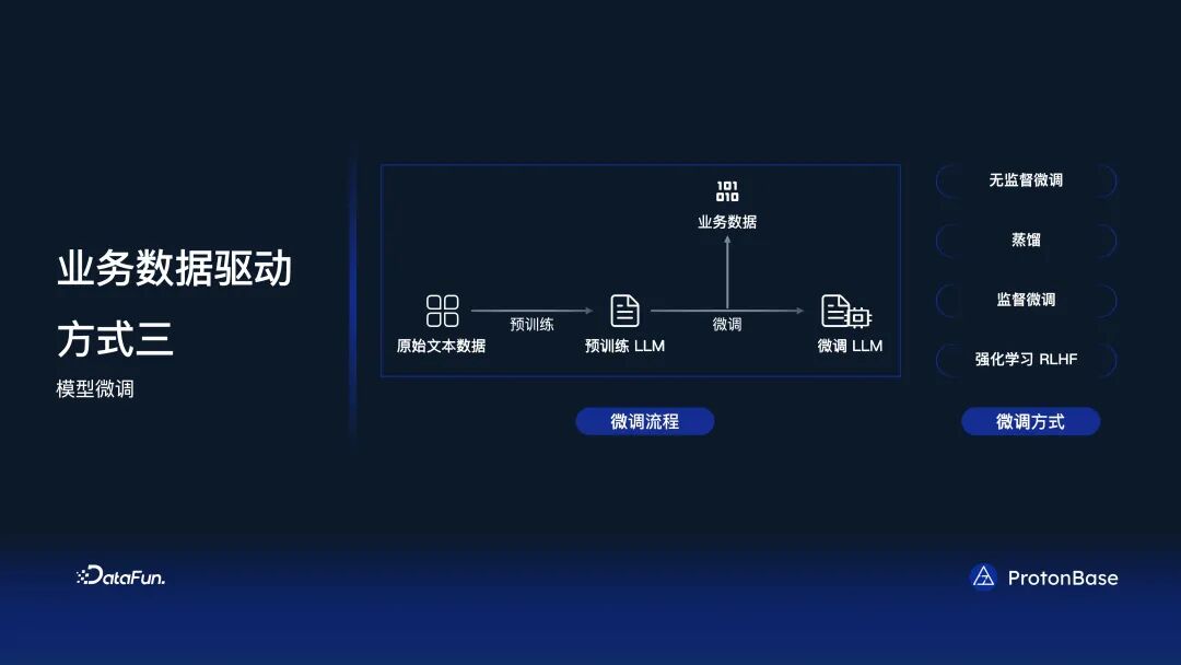 业务数据驱动智能的第三个方式是模型微调。检索增强生成技术通过文本嵌入模型把数据变成嵌入向量,也就是知识。而模型微调的基本想法是让通用模型去学习业务相关的领域知识,从而让这些领域知识成为模型的内在能力。微调的流程首先把业务数据做各种清洗加工,然后让大语言模型去学习这些高质量的数据集,从而成为一个理解业务数据的一个大语言模型。微调的方式一般会分为四种:无监督微调、蒸馏、监督微调、以及强化学习。