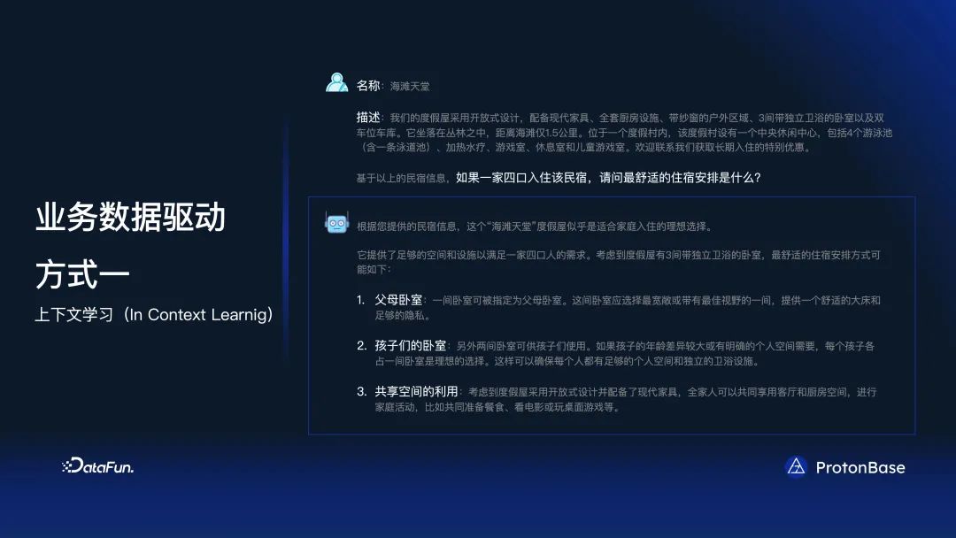 第一种方式是上下文学习(也就是 In-context-learning)。这里举一个例子,用户对某个民宿感兴趣,但是他不确信这个民宿是否能够让家里的所有成员都住得比较舒适。当然他可以自己去详细地了解这个民宿的所有信息,然后再看是否能住下,但这无疑是件繁琐的事情。于是我们想利用大语言模型的能力来完成这样一个规划,把这个民宿的描述等信息给到大语言模型,然后再向大语言模型提问,请它安排一下家人的住宿。大家可以看到大语言模型在了解了这些信息之后,给出了一个非常合理的安排。这就是大语言模型一个核心的能力,它可以从上下文当中学习知识,并且把自己的智能应用在这些新学的知识上。