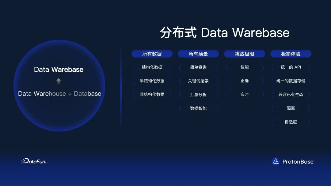通过这些技术的变革,就可以构建出一类全新的数据产品:分布式 Data Warebase。Data Warebase 这个词是 Data Warehouse 和 Database 这两个词的组合,它意味着 Data Warebase 同时具有了 Data Warehouse 和 Database 的所有能力和优势。