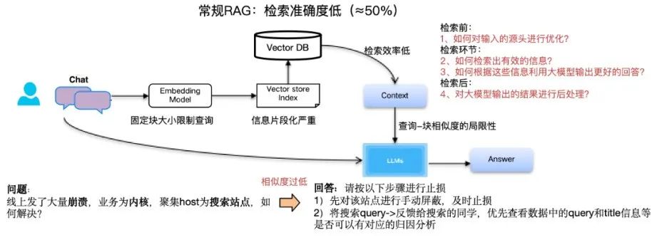 - 检索效率低:当数据库非常大时,对所有块进行相似度比较的过程仍可能非常耗时,这对于需要实时或近实时响应的应用来说,是一个显著的瓶颈。