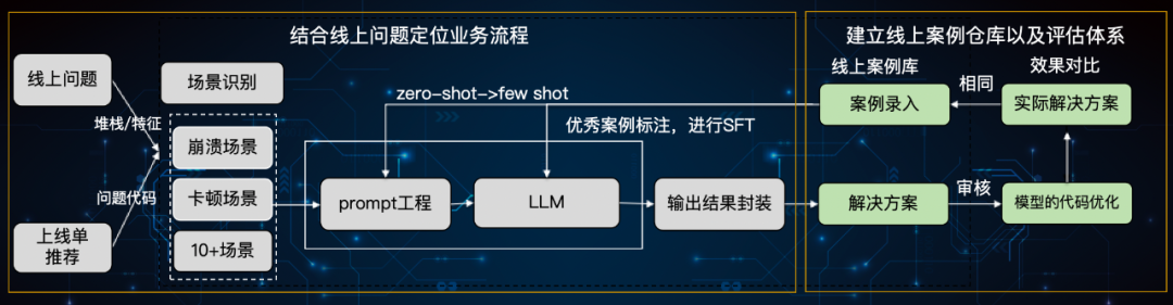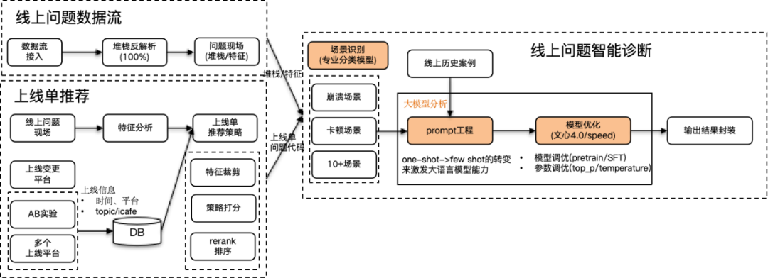 ③ 通过步骤①可以获得问题现场、通过步骤②可以获得上线单以及问题代码,结合两者信息,通过LLM建立一键式线上问题智能诊断,整体的设计如下: