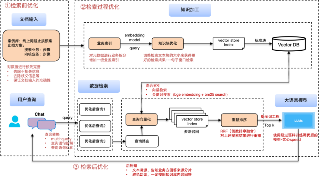 1、如何对输入的源头进行优化? | 数据增强 | 在检索前对数据进行预先完善,去除不相关信息,歧义信息等,保证文档输入的准确性。 |