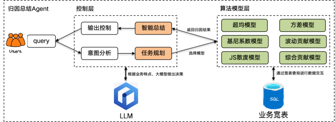 在数据归因总结模块的设计中,采取了一种结合大型模型与专业化小型模型的策略。对于某些专业垂类领域,业界已有的成熟模型和算法在精确度上比直接应用大型模型进行分析准确率有明显优势。因此在归因分析总结过程中,大型模型利用自身出色的归纳和总结能力及决策判断力来负责归因算法的选择以及和对输出结果总结,而具体的归因分析则是在算法模型层实现。整个架构的设计如下: