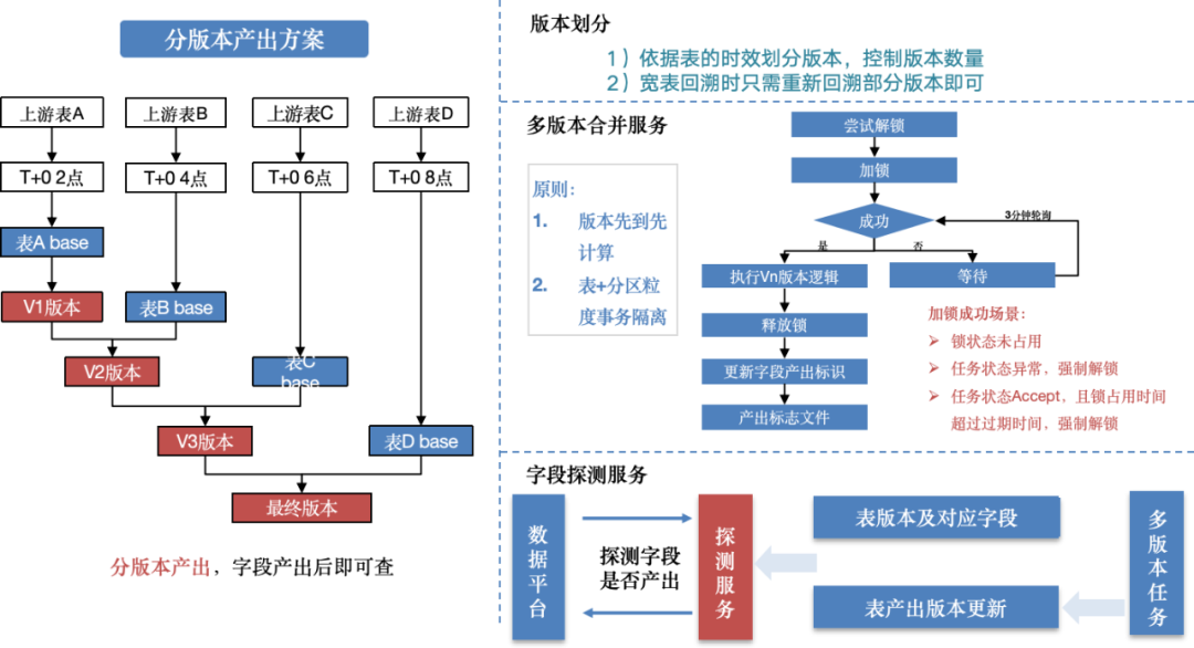 为确保各版本数据在产出后能够迅速合并至宽表,并避免同一分区内同时运行两个合并任务导致数据混乱的问题,我们引入了分布式锁服务。这一机制保证了每个宽表在任意时刻仅有一个合并任务或回溯任务在执行,通过抢占锁来决定是否进行合并。同时,由于多版本宽表中的字段基于时效差异进行分版本产出,因此需要提供依赖检查机制,以便下游及时使用已就绪的字段,满足高时效的数据应用场景。针对不同的场景,方案中提供了三种不同的依赖检查方式: