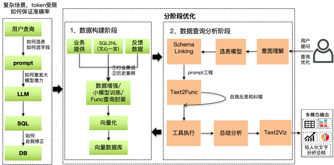 在生成式BI中,业界的通用的技术方案均是将表的schema的信息以及用户查询信息通过prompt工程传输给大模型让其生成SQL或者方法,但是在较为复杂的场景下,上述方案在落地的过程中遇到了许多问题,比如查询的准确性、时效性、大模型的token长度限制等。为了解决上述问题,我们将生成式BI分成了两个阶段: