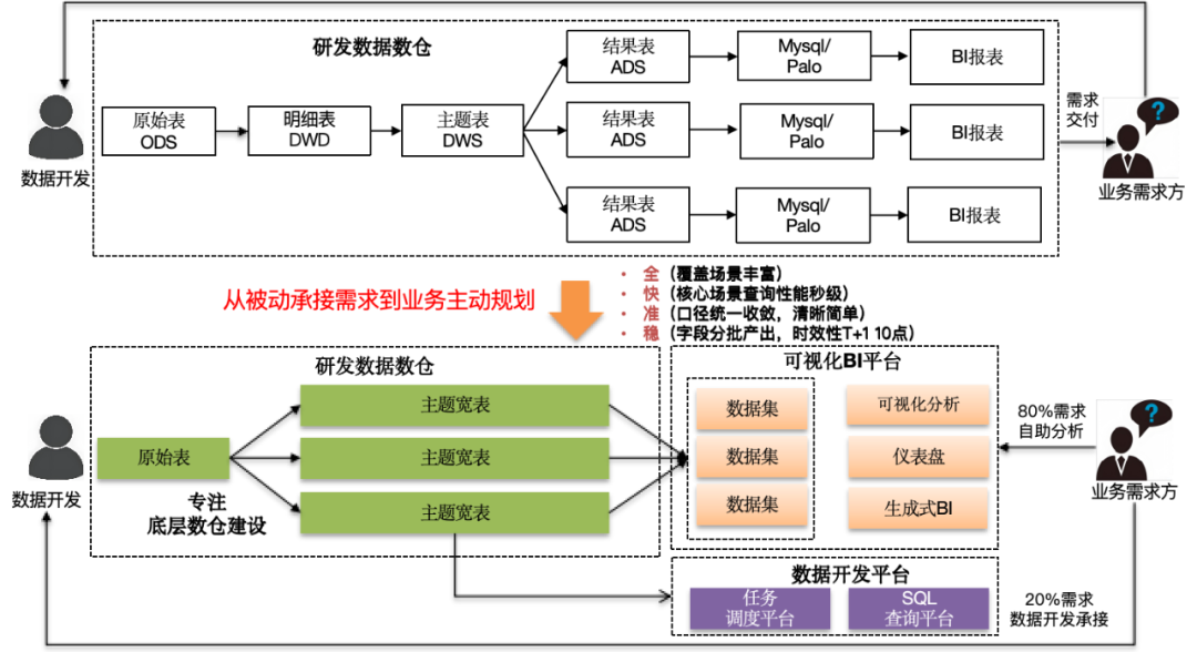 用户请求经过上述两个环节返回给用户,因此线上问题智能分析的回答准确率取决于控制器的任务规划能力以及各个任务Agent的执行任务的准确率。接下来,分别对智能分析的各个核心组件进行介绍。数据分析归因组件核心的能力是生成式BI以及数据自动归因的能力,而这些能力的关键指标是回答的准确率。提升准确率的关键在于以下两方面:数仓建设:合理的数仓建设至关重要,它可以显著提高生成式BI和数据归因能力的准确性。SQL语句的层级数量、多表关联的复杂度以及字段的清晰度都会严重影响生成的SQL质量以及归因的结果。数据工程:在数据仓库合理建模之后,通过一系列数据工程技术,激发大模型的回答潜力,同时对大模型自身进行调优,显著提升大模型在数据分析中的表现。在业界,通常采用分层模型来构建数据仓库。当业务部门需要查看某个指标的数据变化时,会向数据中台提出需求。数据研发团队会按照ODS->DWD->DWS->ADS逐层进行建模,并通过定制化开发ADS层来满足业务需求。最终,这些数据会配置成多个图表,保存到报表中供业务查看。尽管这种建设思路可以满足业务的数据需求,但也面临以下三个主要问题:- 灵活性不足:复杂多变的业务场景都需要数据研发的参与,时间依赖开发侧排期。定制化结果灵活性不足,需频繁迭代,ADS层占用了数据研发团队大量的时间和精力。