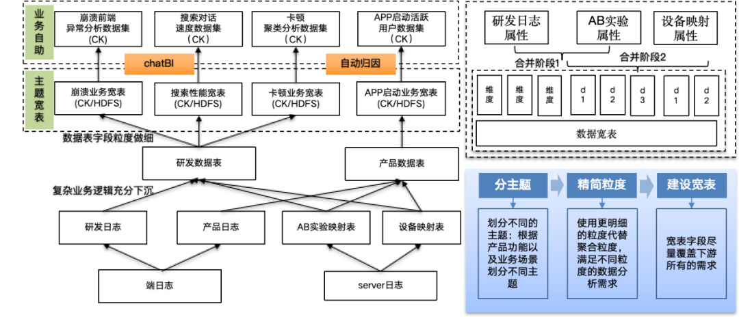 研发数据业务场景复杂,数据来源多,包括研发流量日志、产品流量日志、业务数据日志及server集群日志等,为了平衡数据时效性及易用性,共构建了500+张DWD、DWS及ADS分层报表,这个报表层级存在表血缘关系复杂、中间表冗余、数据口径不一致、SQL复杂度高等问题。为了解决上述问题,我们提出宽表建模方案:根据产品功能和业务场景划分主题,明确主题最细粒度及所有的业务过程,基于ODS表直接构建宽表层,宽表覆盖业务所需全部字段,支持即席分析、报表查询、自动归因、ChatBI等所有数据应用场景。基于上面的建模思路,研发数据中台的整体宽表设计如下: