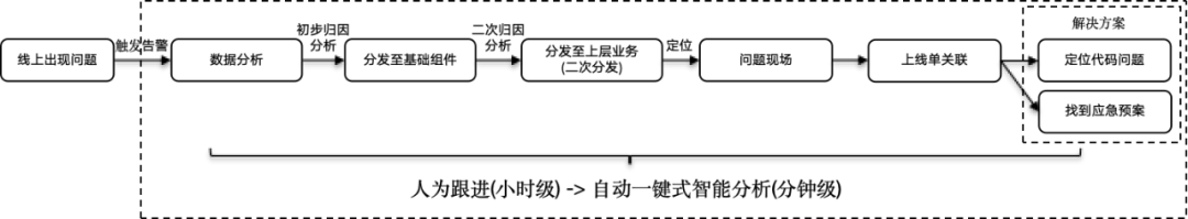 从流程可以看出,目前对于现场问题的定位,绝大多数环节都需要人为参与分析和定位。问题的定位和解决时间高度依赖于接收到告警的同学的分析能力以及他对系统各个组件的熟悉程度,这导致了整体定位时间过长(通常在小时级别)。这种情况可能导致原本的P4问题恶化为P1问题。如果我们能够利用大模型强大的泛化能力、自动化决策能力,对上述流程进行重构,将当前的人为逐步跟进的线上问题解决方式优化为自动一键式解决方案(智能分析),那么问题的整体定位时间将大大缩短,从小时级优化到分钟级别。以线上告警为例,通过智能分析,问题的自动归因、问题上线单的关联、问题的止损方案以及解决步骤均可实现一键式解决。