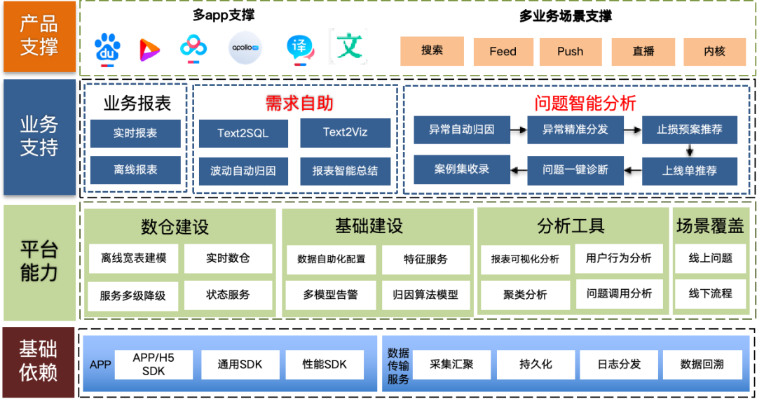 - 端到端服务:结合业务流程,提供数据报表、平台工具进行端到端的支持,帮助业务方排查和解决问题。例如,线上问题的智能分析和云控拨测等服务。