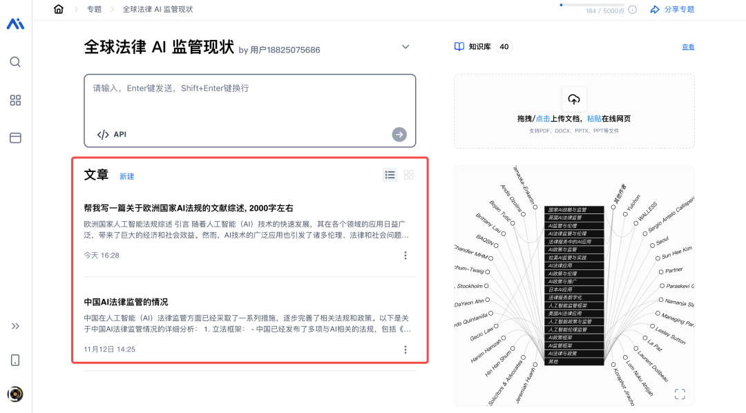 在专题页面,支持上传 PDF、Word、PPT 等文件,还可以粘贴在线网页。上传之后,AI 会对内容进行解析,然后你在这个专题里搜索的时候,秘塔 AI 就能把这些上传的内容,作为信息来源了。前段时间,法律修音机发布了 160 份法律 AI / 科技相关的研究报告,内容非常多,想快速了解其中的某个问题,需要借助 AI 的能力。例如,随着 AI 技术不断发展,世界各国相继针对 AI 在法律行业的应用发布了相应的监管规定,目前我们收集了 30 多个国家的数据。现在,我想知道世界各国具体是怎么规定的,于是我就把研报库中,这 30 多个国家的 AI 监管规定,上传到秘塔 AI 的专题库里。然后,秘塔 AI 就会基于专题知识库进行搜索(不联网),信息源仅限于这个专题知识库,然后输出答案,总体来看回答结果很准确。在这个总结性回答右侧,还有思维导图,甚至可以直接生成 PPT:引用的信息源也清晰地标明 —— 点击回答中小书本?一样的 icon,或者在参考资料里,就能看到 AI 参考了专题库里的哪个资料。对于 AI 输出的内容,还可以点击“研究”,对这个问题进行更深入的研究,以及“追问”、“编辑”等操作,最后再导出 Word、PDF。同时,你还可以把 AI 生成的内容收藏到专题库中 —— 点击问题旁边的“+号”,即可将该回答收藏到这个专题的知识库中。以后,你想问什么就问,当 AI 查到你满意的内容,点个收藏,就可以把回答结果以“文章”的形式保存在这个专题的知识库里。你平时使用这个专题时,收藏的问答会显示在专题页下的「文章」模块。