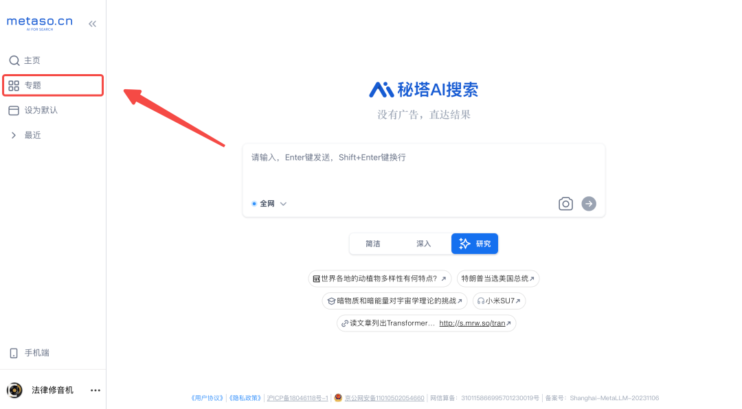 在 AI 搜索领域,「秘塔搜索」就是个扛把子选手,尤其是在学术研究领域好评颇高。最近,秘塔上线了一个新功能:在秘塔首页的左侧边栏,新增了一个「专题」入口。