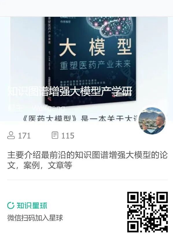欢迎加入「知识图谱增强大模型产学研」知识星球,获取最新产学研相关"知识图谱+大模型"相关论文、政府企业落地案例、避坑指南、电子书、文章等,行业重点是医疗护理、医药大健康、工业能源制造领域,也会跟踪AI4S科学研究相关内容,以及Palantir、OpenAI、微软、Writer、Glean、OpenEvidence等相关公司进展。